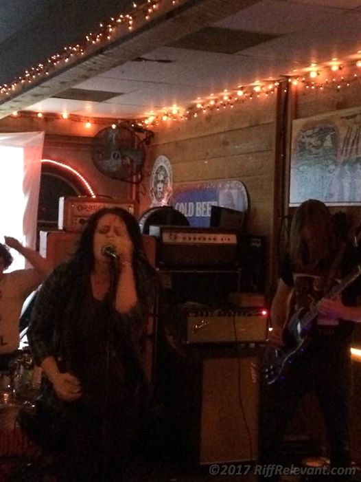 Bolstered by a backdrop of visuals that would nicely accompany an LSD trip, Indighost‘s guitarists Dan Fehr and Cody Gilmer provided some incendiary guitar antics, as well. While doing so, bassist Quentin Garrett and drummer Taylor Cogdill kept things well anchored in place; Cogdill being a powerhouse drummer with a solid batting style. One of the band’s strongest traits is singer Randi Denton‘s bluesy vocals-by-way-of-classic rock greats like Stevie Nicks or Janis Joplin.