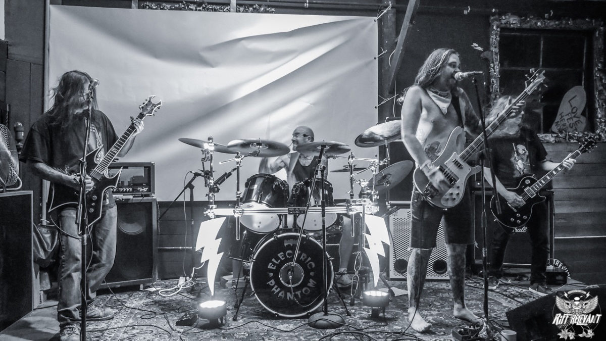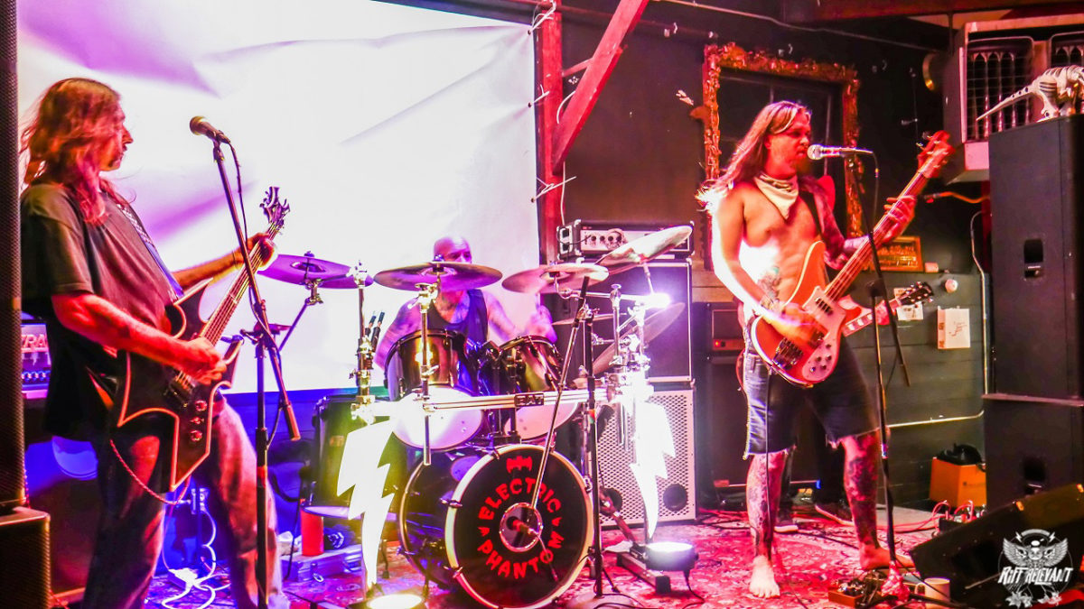 From the moment ELECTRIC PHANTOM began setting up, I surmised they were going to be of a “different” breed altogether. How did I come to such a conclusion, you ask? After decades of doing what I do, I just know these things. That realization was helped along by their stage props, use of lights, and colorful items, all that type of stuff. Once the cast of characters, Eli “Mansome Dan” Williams (bass/ vocals), Shane “The Bat” Francis (drums), and guitarists Randy Hampton and Ki Adams, began playing, my surmising was validated as spot-on.