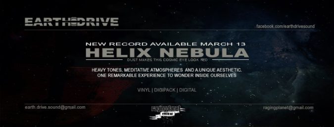 Listen to the audio single here below. Included with it, the Daniel Martin Diaz created album artwork and tracklist. The new EARTH DRIVE album ‘Helix Nebula‘ is due March 13th from Raging Planet.